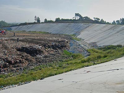 固體廢棄物垃圾填埋一般是利用山坳、開挖過的礦山等進行填埋防滲。填埋場的防滲層上面都是要填埋成千上萬噸的垃圾,所以一般采用1.5mm以上厚度的防滲膜,幅寬也應大于6米,減少焊接縫。因為實踐證明,填埋場的滲漏70%出現在焊接縫。坡面可采用糙面土工膜,增加摩擦系數,使可用容積達到大化。