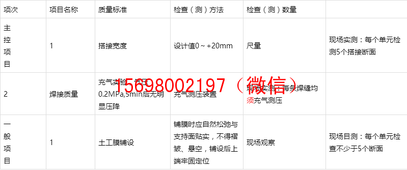 表9.1 土工膜鋪設質量檢查項目和質量標準