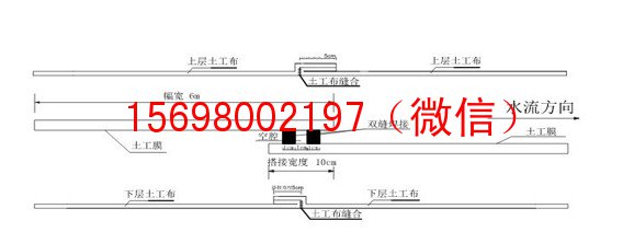 5.4.1為便于接縫,復合土工膜兩側預留10-20cm寬光面膜,垂直于水流方向鋪設,搭接寬度不小于10cm,上游一幅邊壓下游一幅邊。在復合土工膜焊接前先將底層布用手持式縫包機用高強維滌綸絲線縫合,縫合時針距控制在6mm左右,連接面松緊適度,自然平順,確保土工膜與土工布聯合受力;再將防滲膜焊接完成后,縫合上層布,搭接處上下層布翻折方向相反,以減少接頭處復合土工膜的疊合厚度。