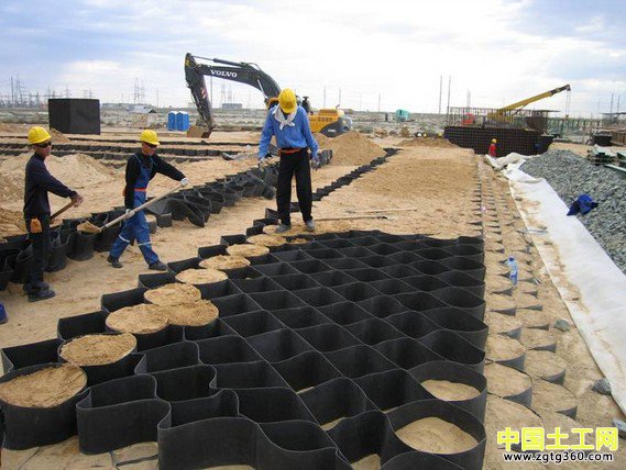 4、格室應(yīng)以主受力方向,由上向下鋪設(shè),使格室片材重垂直于公路路基。絕不可橫向鋪設(shè)。