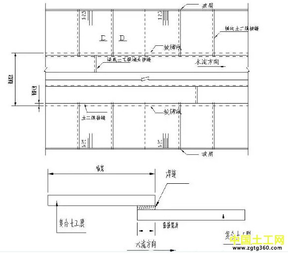 (2)渠底:使復合土工膜幅寬與渠軸線垂直,沿渠軸線方向按先上游壓下游的順序滾鋪。渠底復合土工膜端頭縫與端頭縫、端頭縫與坡面橫向接縫應(yīng)相互錯開100cm 以上。